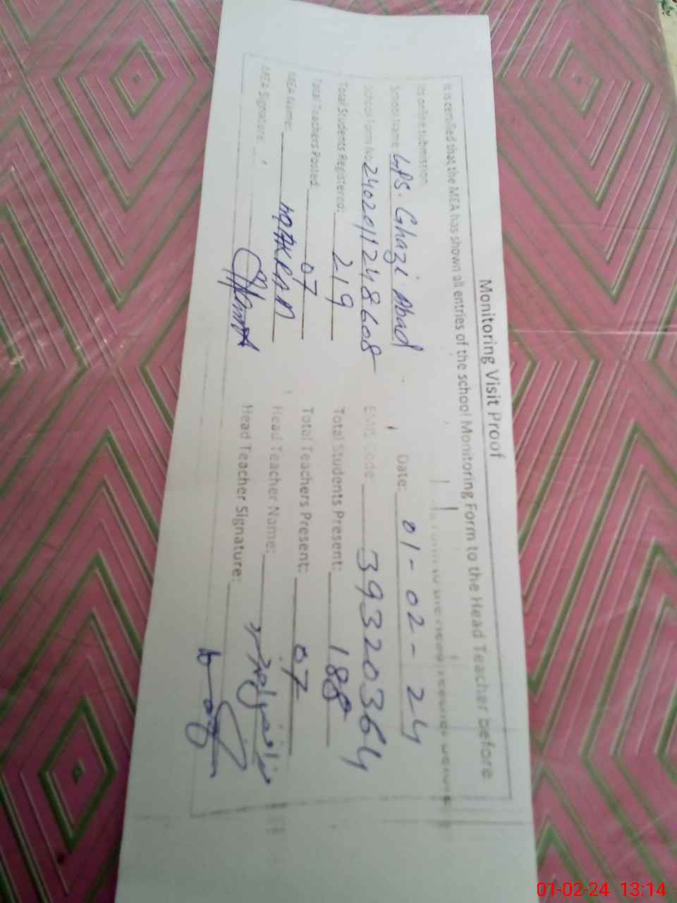 | Attendance Register | Head Teacher | MEA with School | Visit Proof |