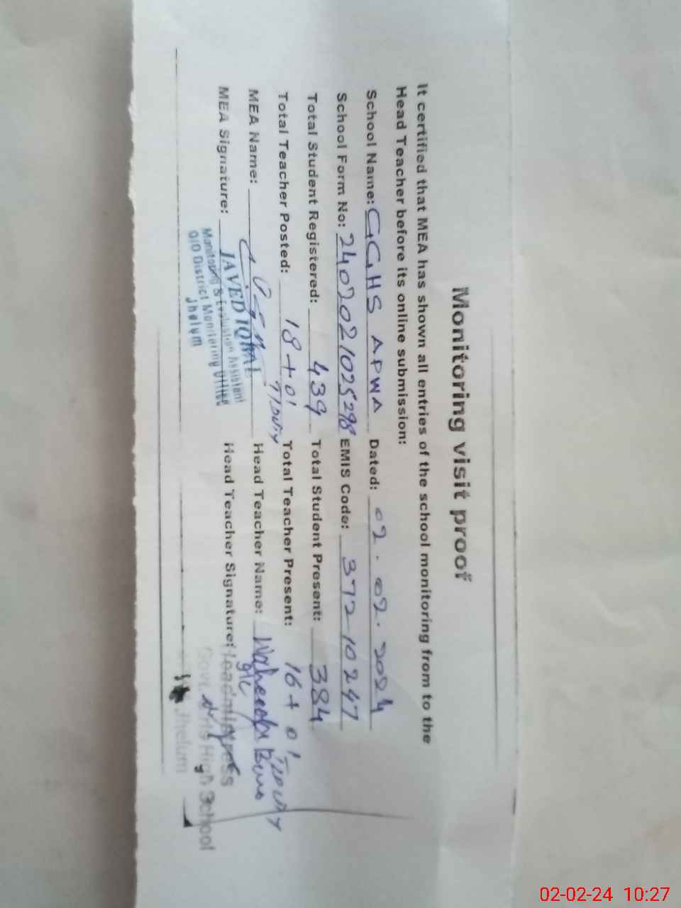 | EMIS Code: 37210247 | Name of School: GGHS APWA JHELUM | |||