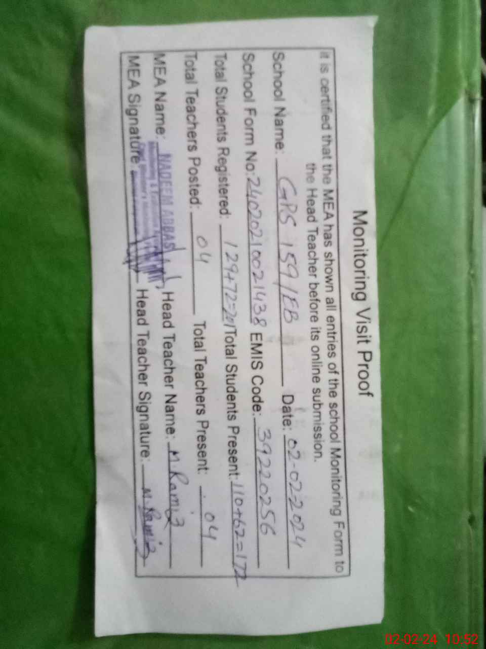 | EMIS Code: 39220256 | Name of School: GPS 159 EB P.O ARIF WALA | |||