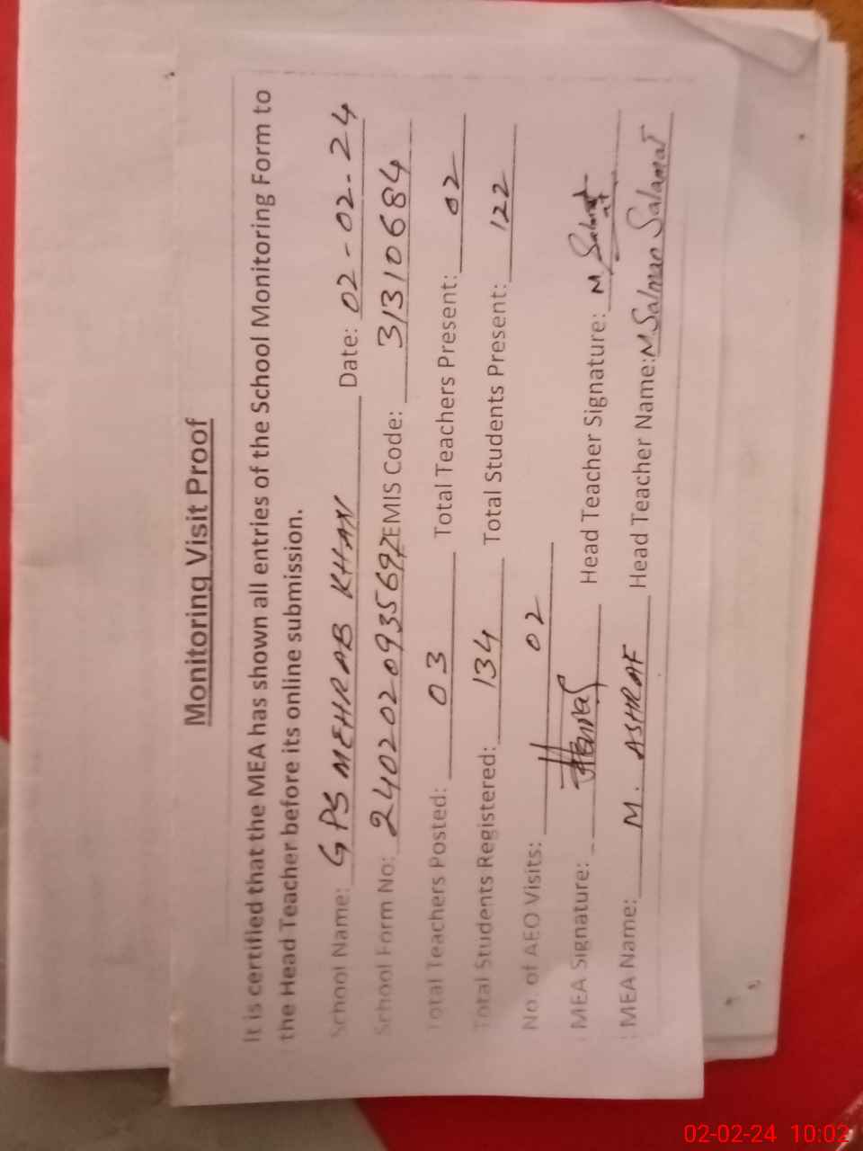 | EMIS Code: 31310684 | Name of School: GPS MEHRAB KHAN | |||