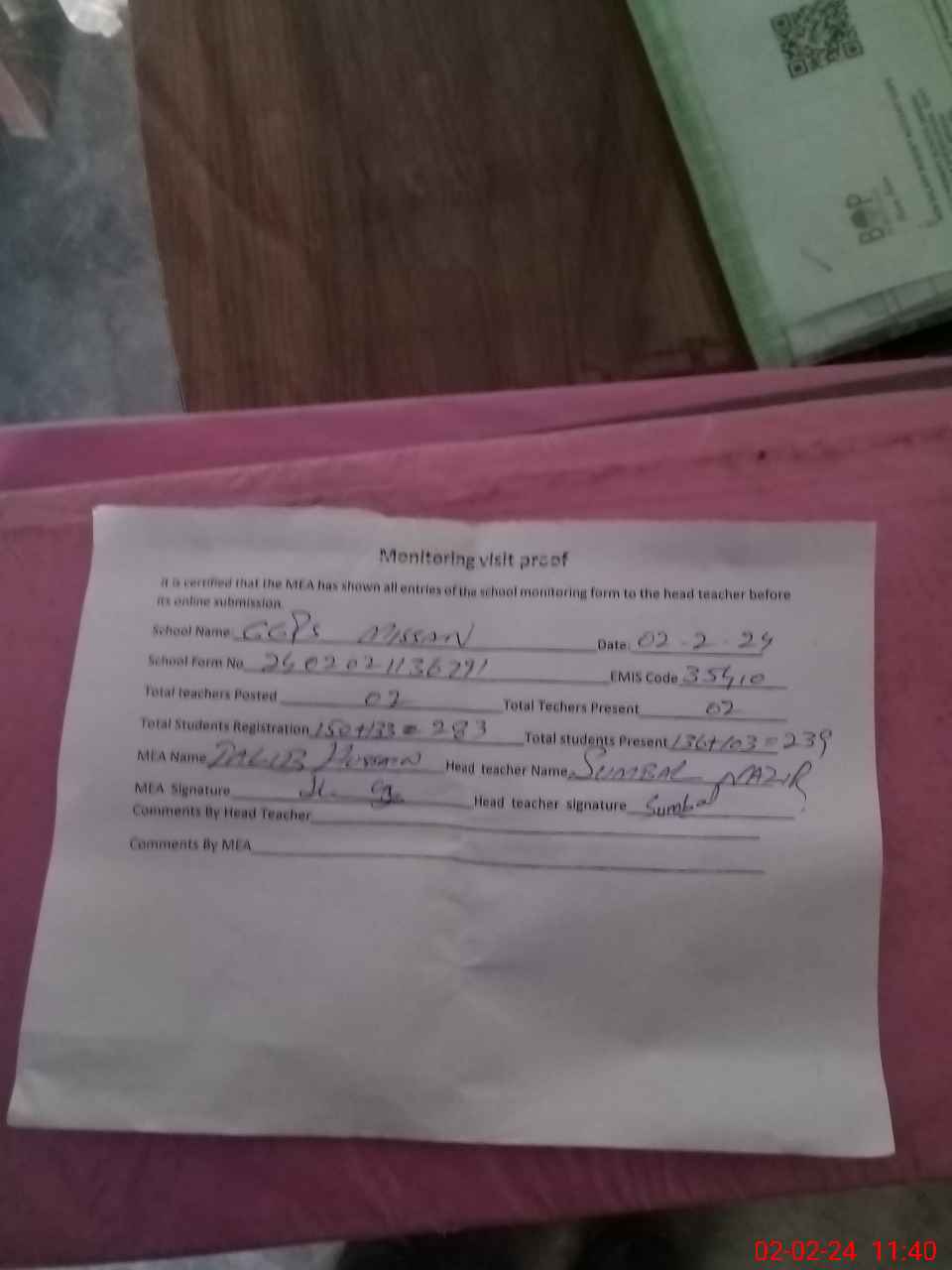 | Attendance Register | Head Teacher | MEA with School | Visit Proof |