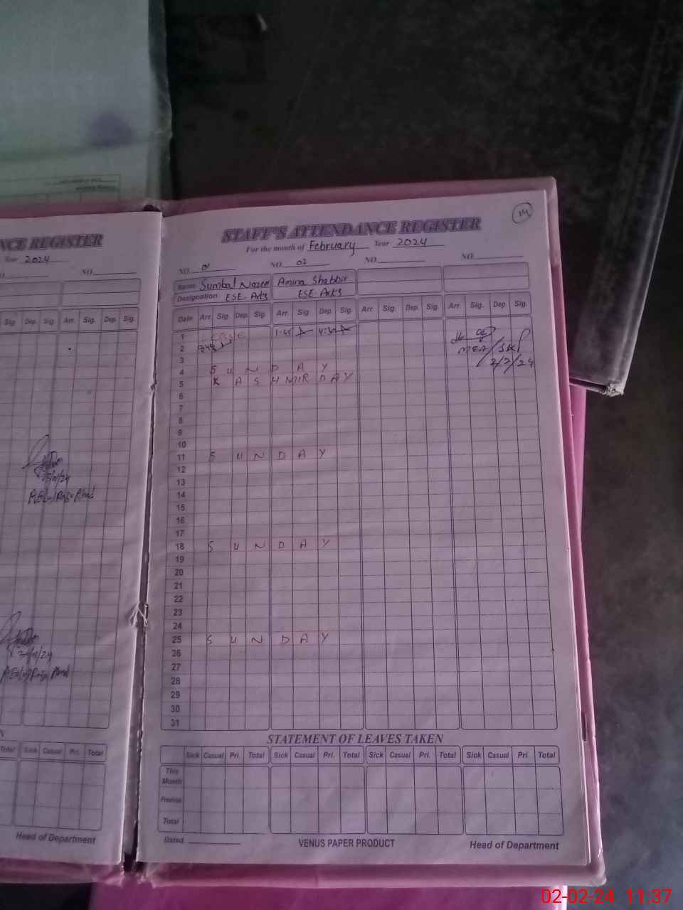 | CNIC | Full Name | Designation | R/C | Absence During Last Calender Month |