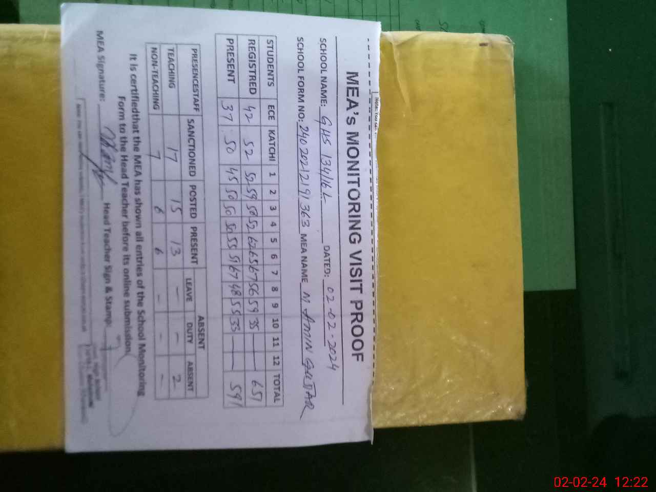 | Attendance Register | Head Teacher | MEA with School | Visit Proof |