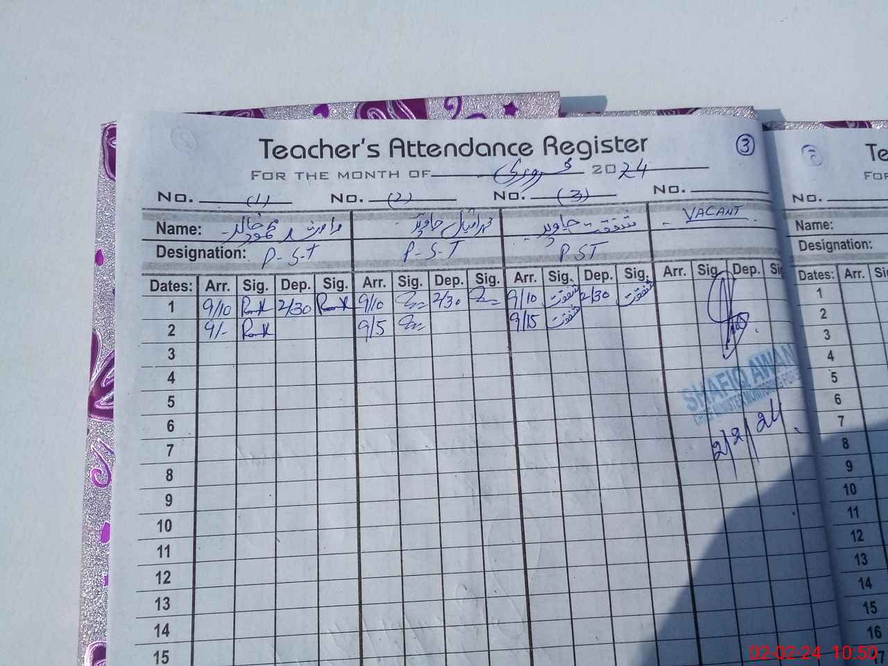 | CNIC | Full Name | Designation | R/C | Absence During Last Calender Month |