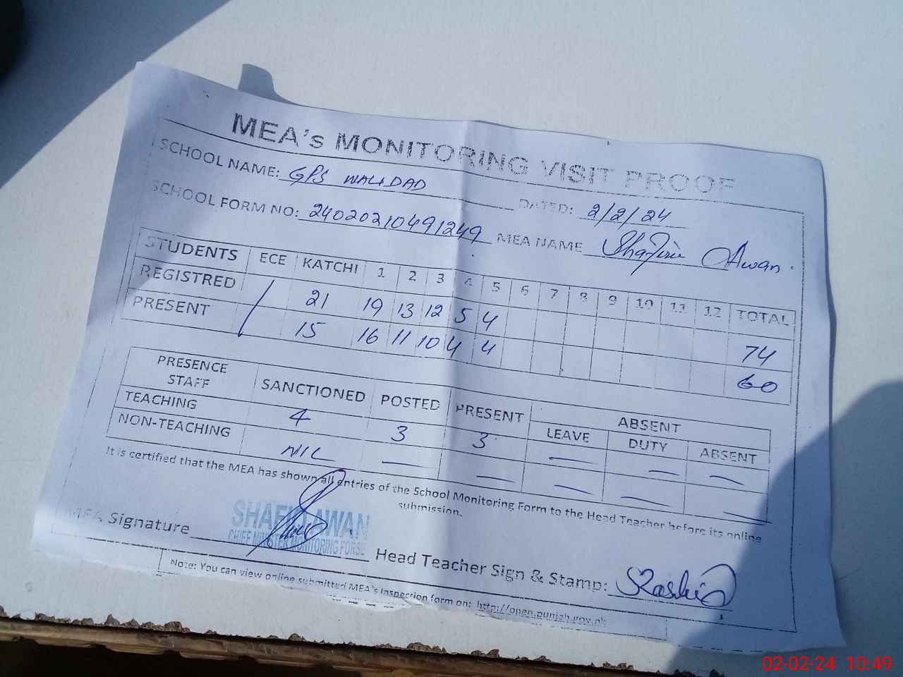 | Attendance Register | Head Teacher | MEA with School | Visit Proof |