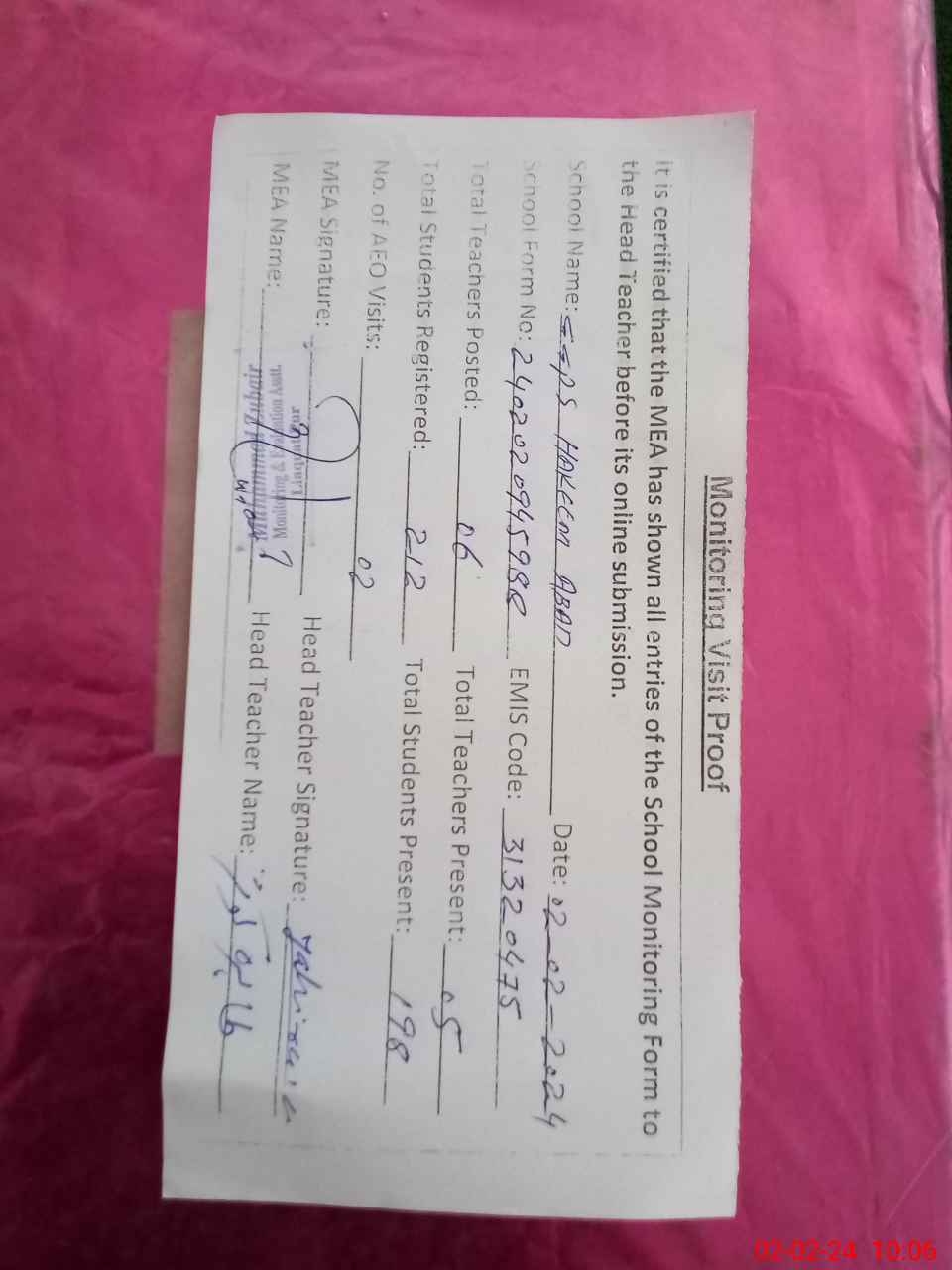 | Attendance Register | Head Teacher | MEA with School | Visit Proof |