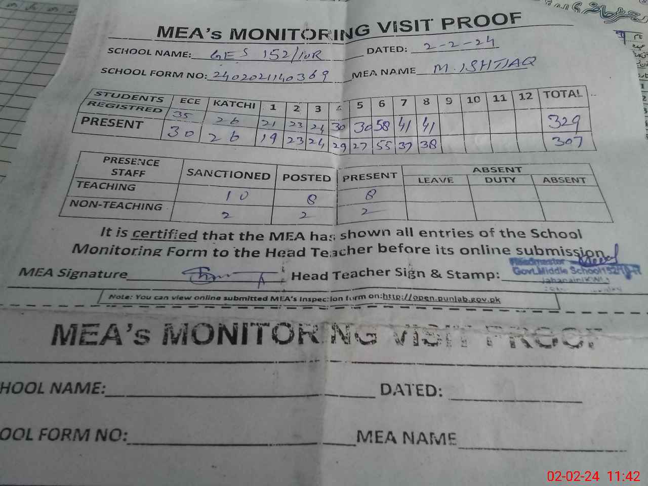 | Attendance Register | Head Teacher | MEA with School | Visit Proof |