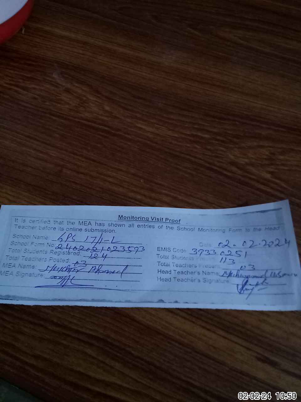 | Attendance Register | Head Teacher | MEA with School | Visit Proof |