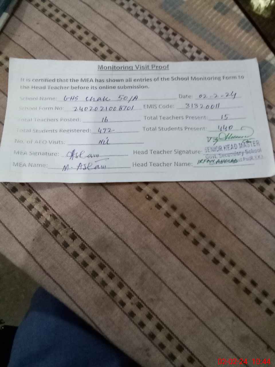 | EMIS Code: 31320011 | Name of School: GHS CHAK NO 50/A | |||