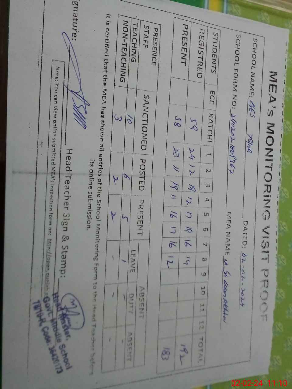 | Certified that this School was Inspected by the Undersigned MEA/DMO Today and the Information Stated Above is as Per Record. | |||||