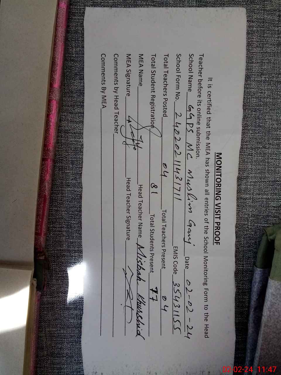 | Attendance Register | Head Teacher | MEA with School | Visit Proof |