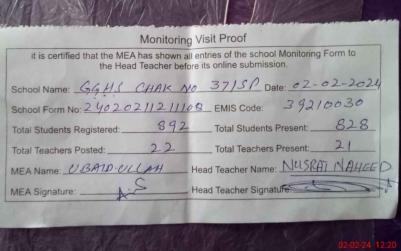 | EMIS Code: 39210030 | Name of School: GGHS 37 SP PAKPATTAN | |||