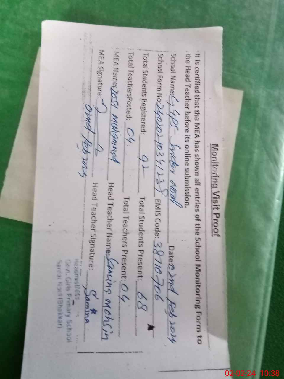 | Certified that this School was Inspected by the Undersigned MEA/DMO Today and the Information Stated Above is as Per Record. | |||||