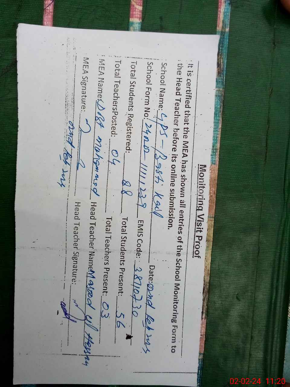 | Attendance Register | Head Teacher | MEA with School | Visit Proof |