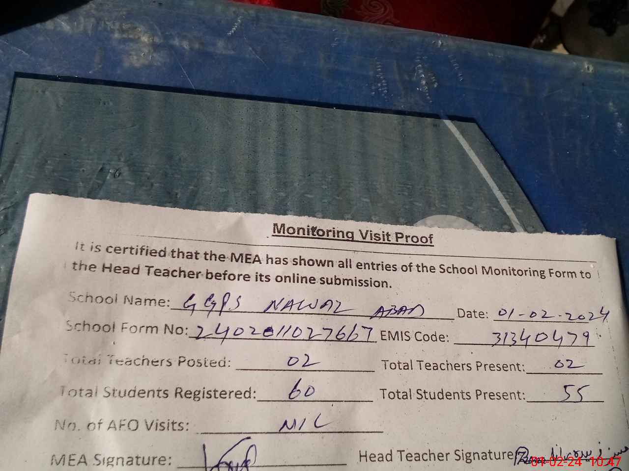 | Attendance Register | Head Teacher | MEA with School | Visit Proof |