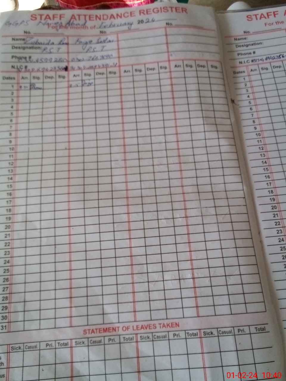 | Name: Zu**** Ra**** Designation: (School Headmaster's/Headmistress's) PST Phone/Cell Number: 03**** |