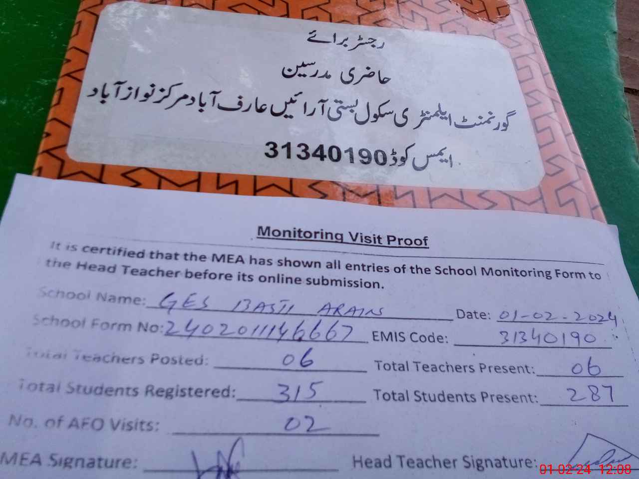 | Attendance Register | Head Teacher | MEA with School | Visit Proof |