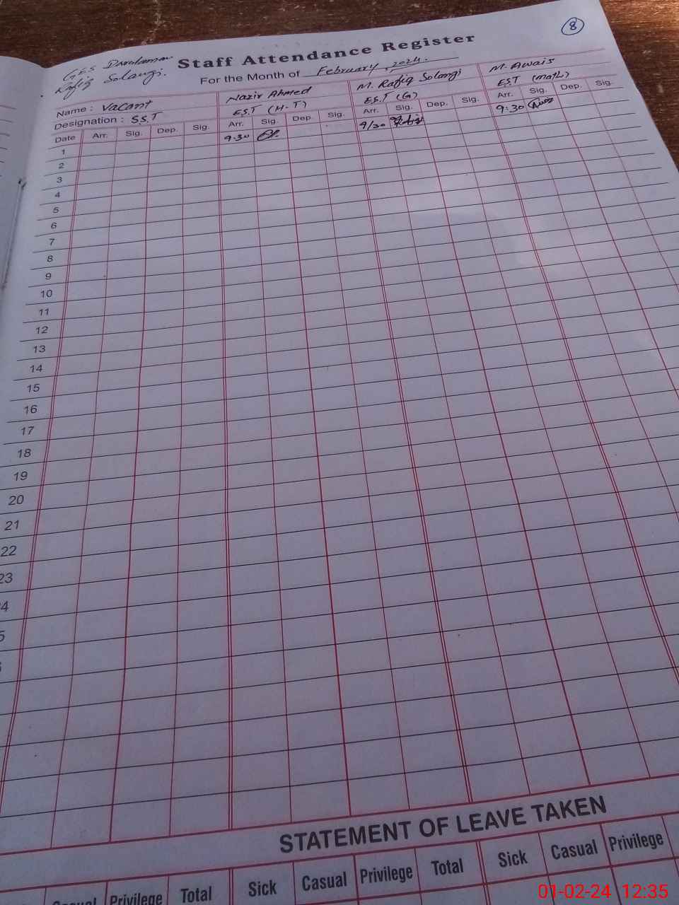 | CNIC | Full Name | Designation | R/C | Absence During Last Calender Month |