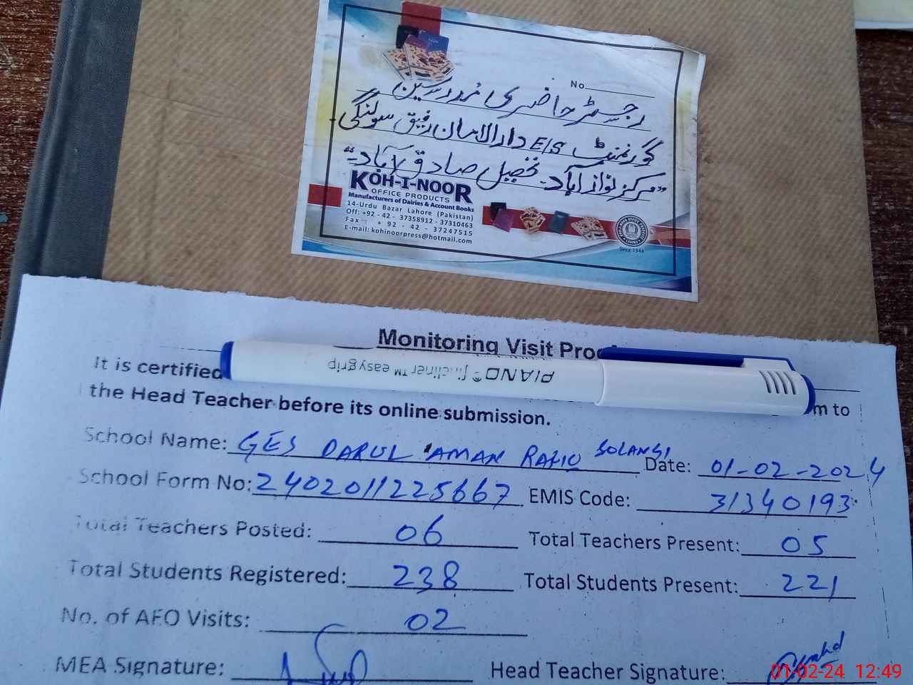 | Attendance Register | Head Teacher | MEA with School | Visit Proof |