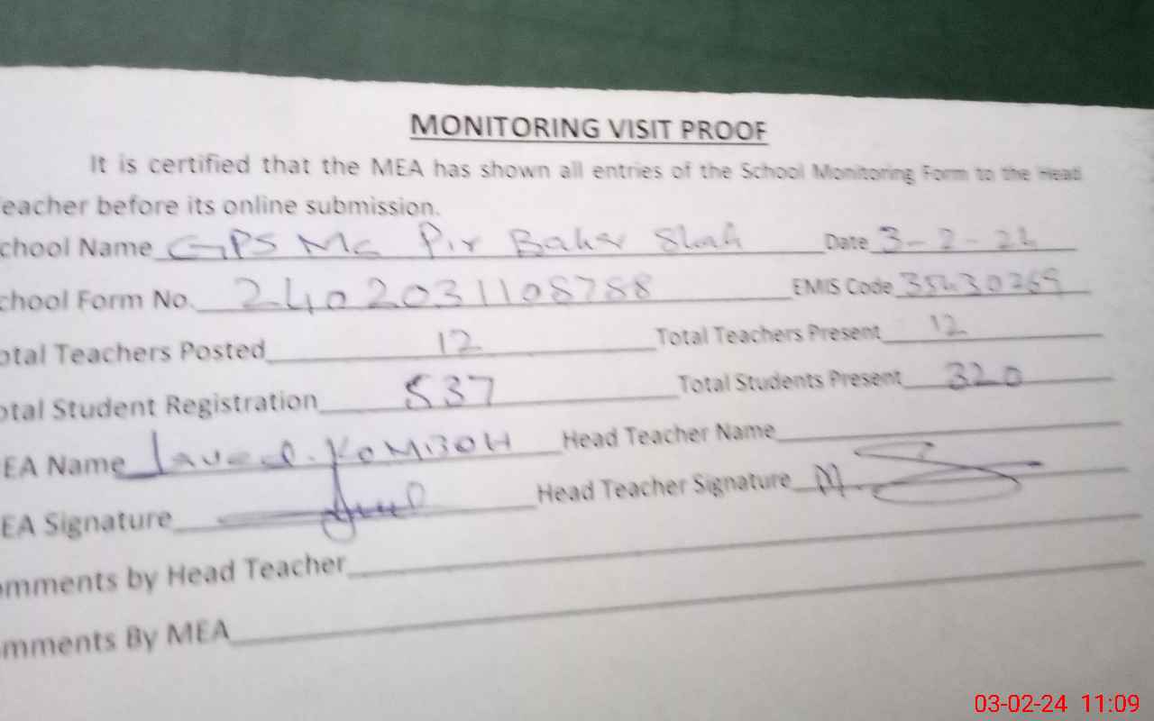 | EMIS Code: 35430269 | Name of School: GPS MC PIR BAHAR SHAH | |||