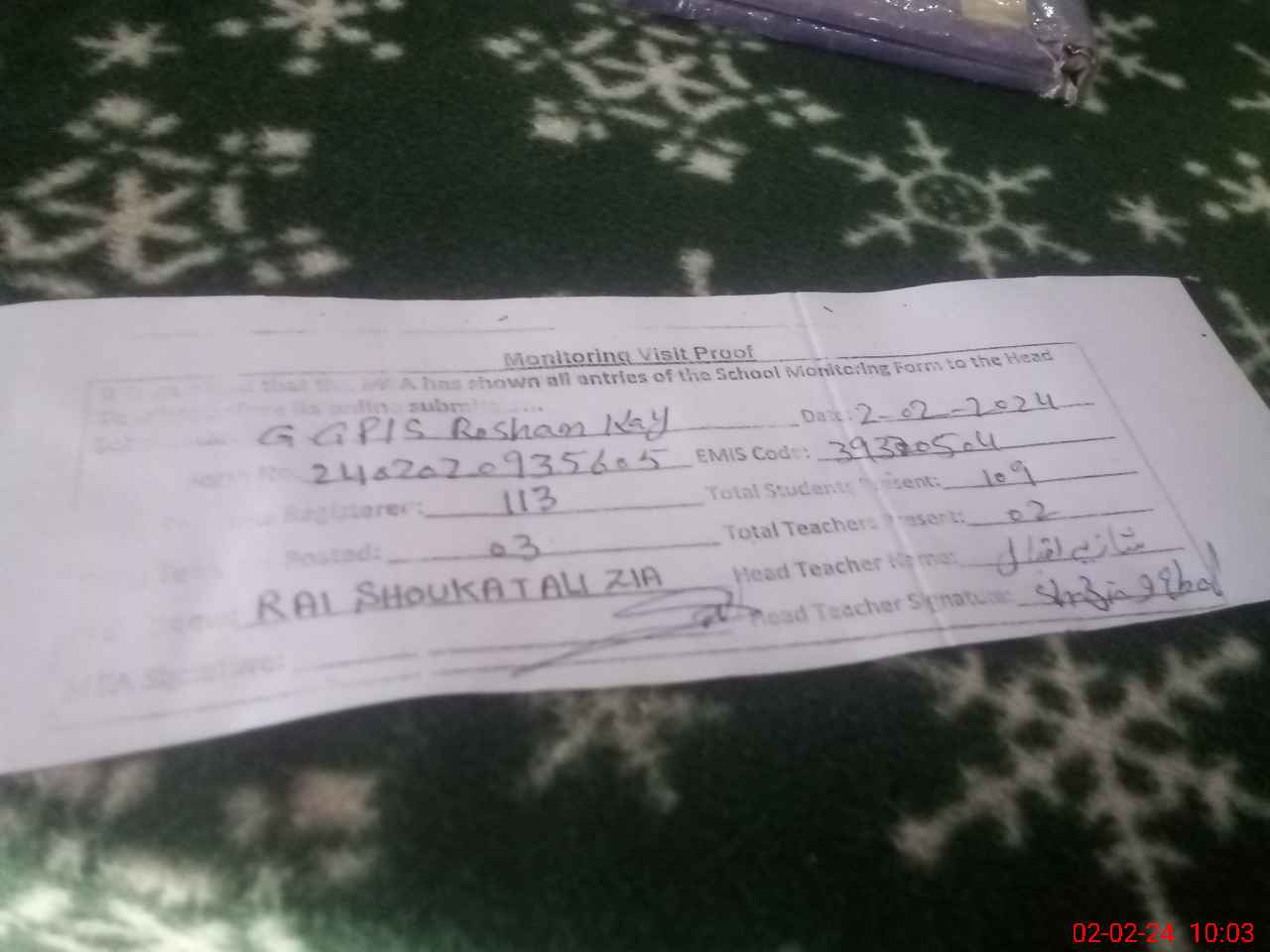 | Monitoring Date: 02-02-2024 | Start Time: 02-02-2024 09:35 AM | End Time: 02-02-2024 10:03 AM | Name of MEA: SH**** AL**** ZI**** (R**** | |