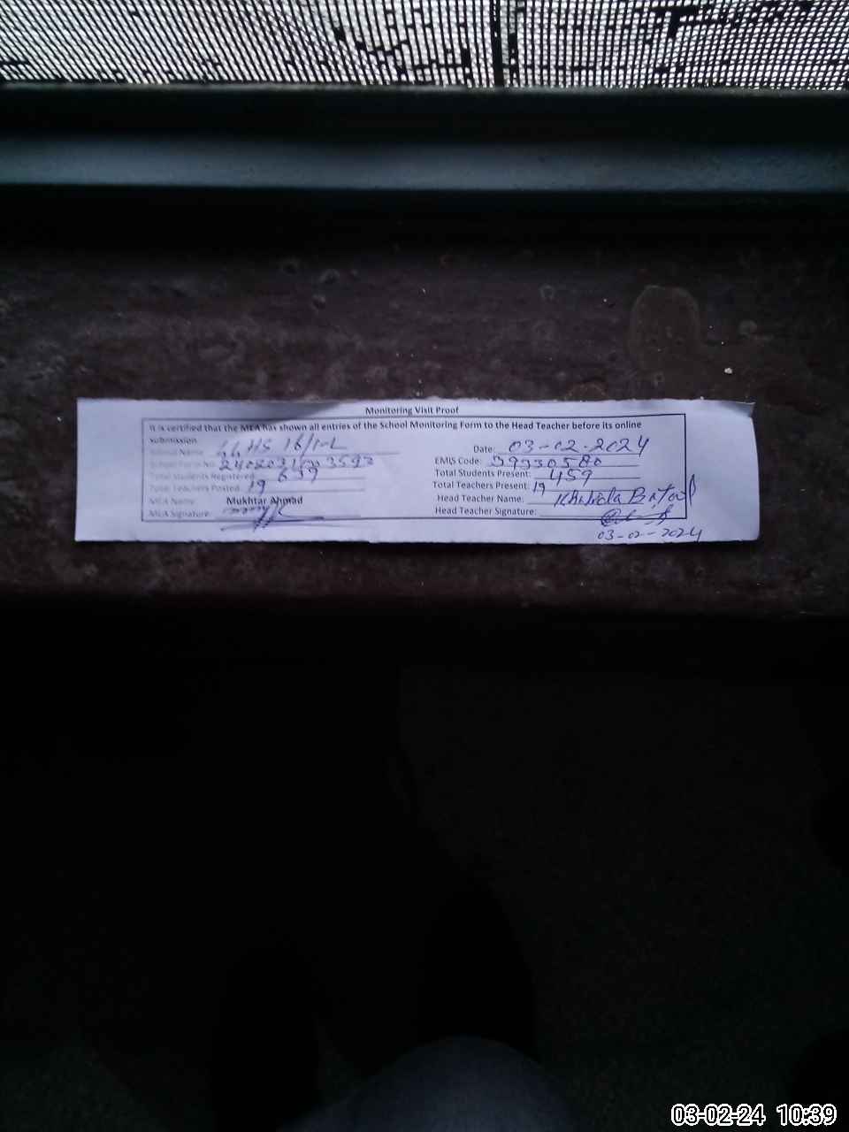 | Attendance Register | Head Teacher | MEA with School | Visit Proof |