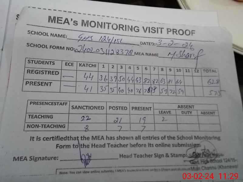| EMIS Code: 36430013 | Name of School: GHS 124/15-L, MIAN CHANNU | |||