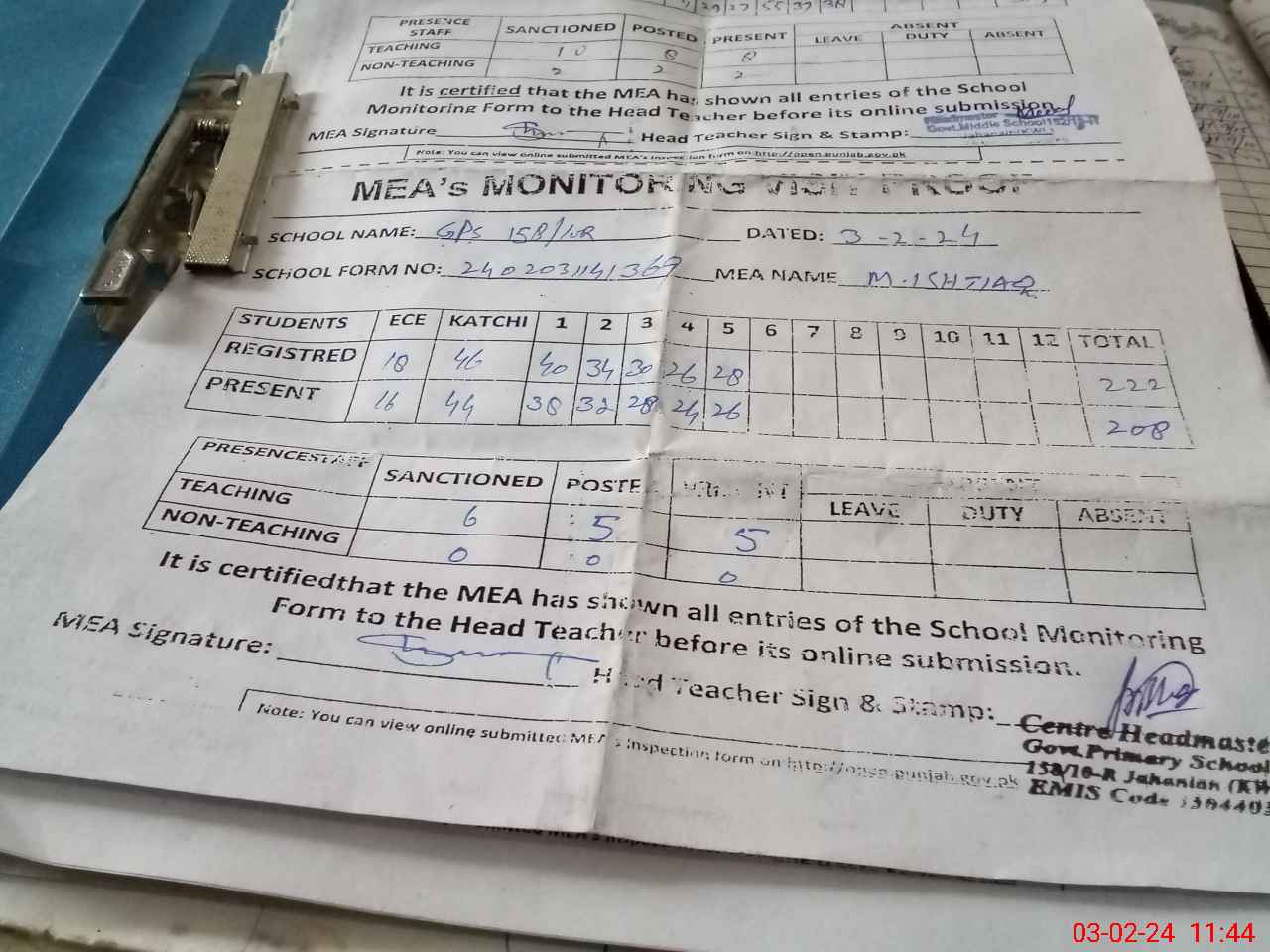 | Certified that this School was Inspected by the Undersigned MEA/DMO Today and the Information Stated Above is as Per Record. | |||||