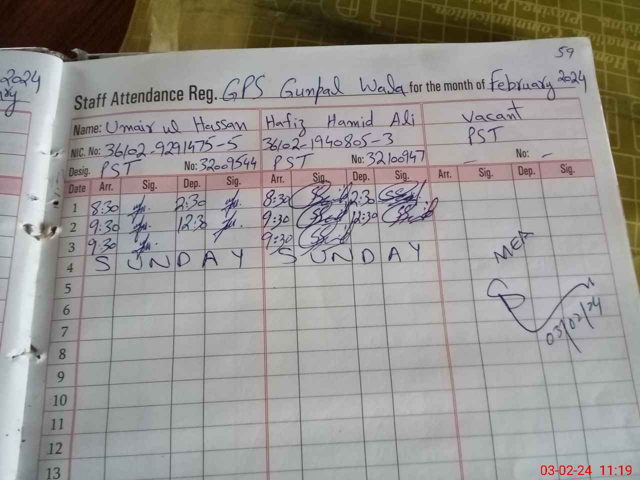 | CNIC | Full Name | Designation | R/C | Absence During Last Calender Month |