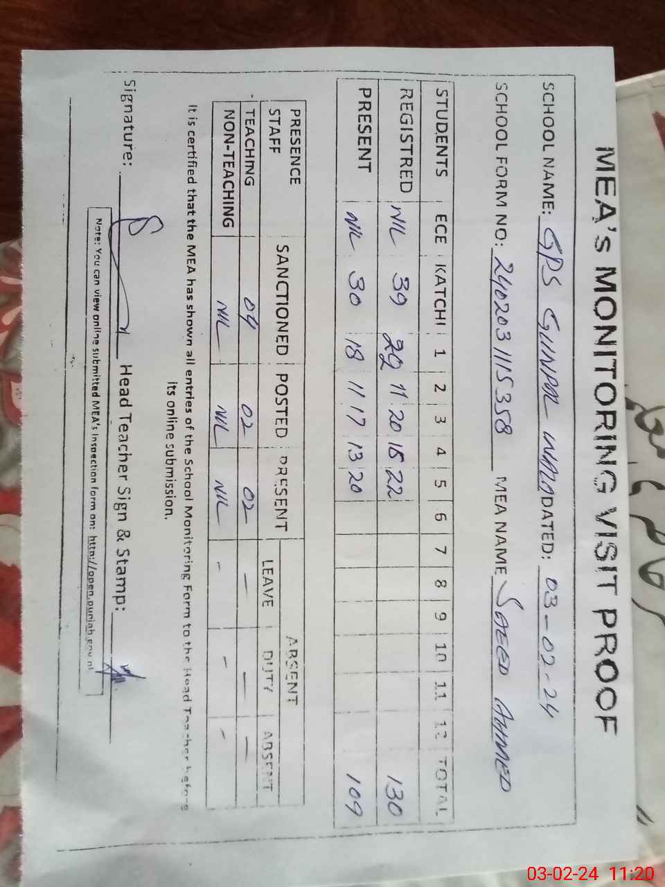 | Attendance Register | Head Teacher | MEA with School | Visit Proof |