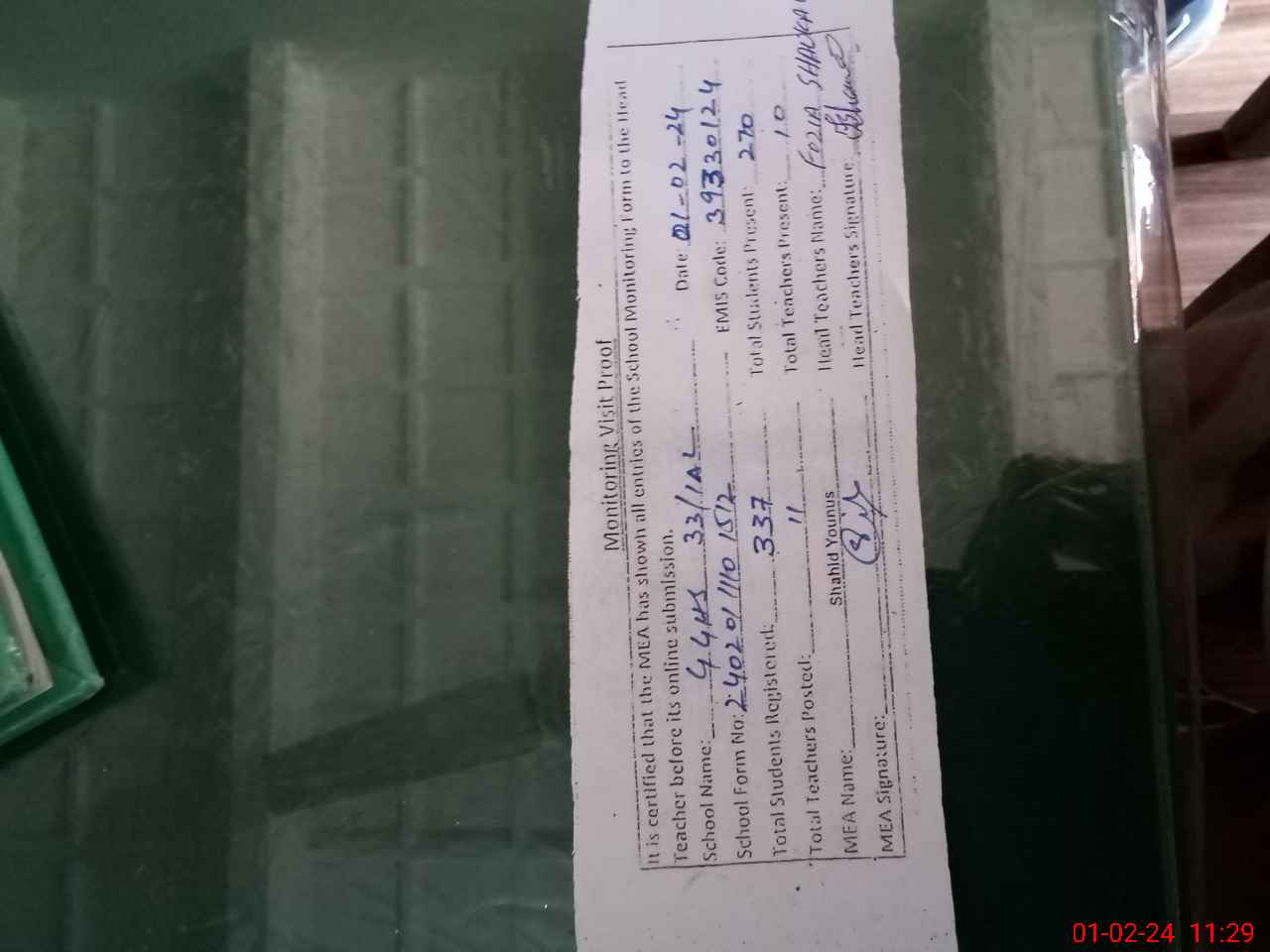 | Attendance Register | Head Teacher | MEA with School | Visit Proof |