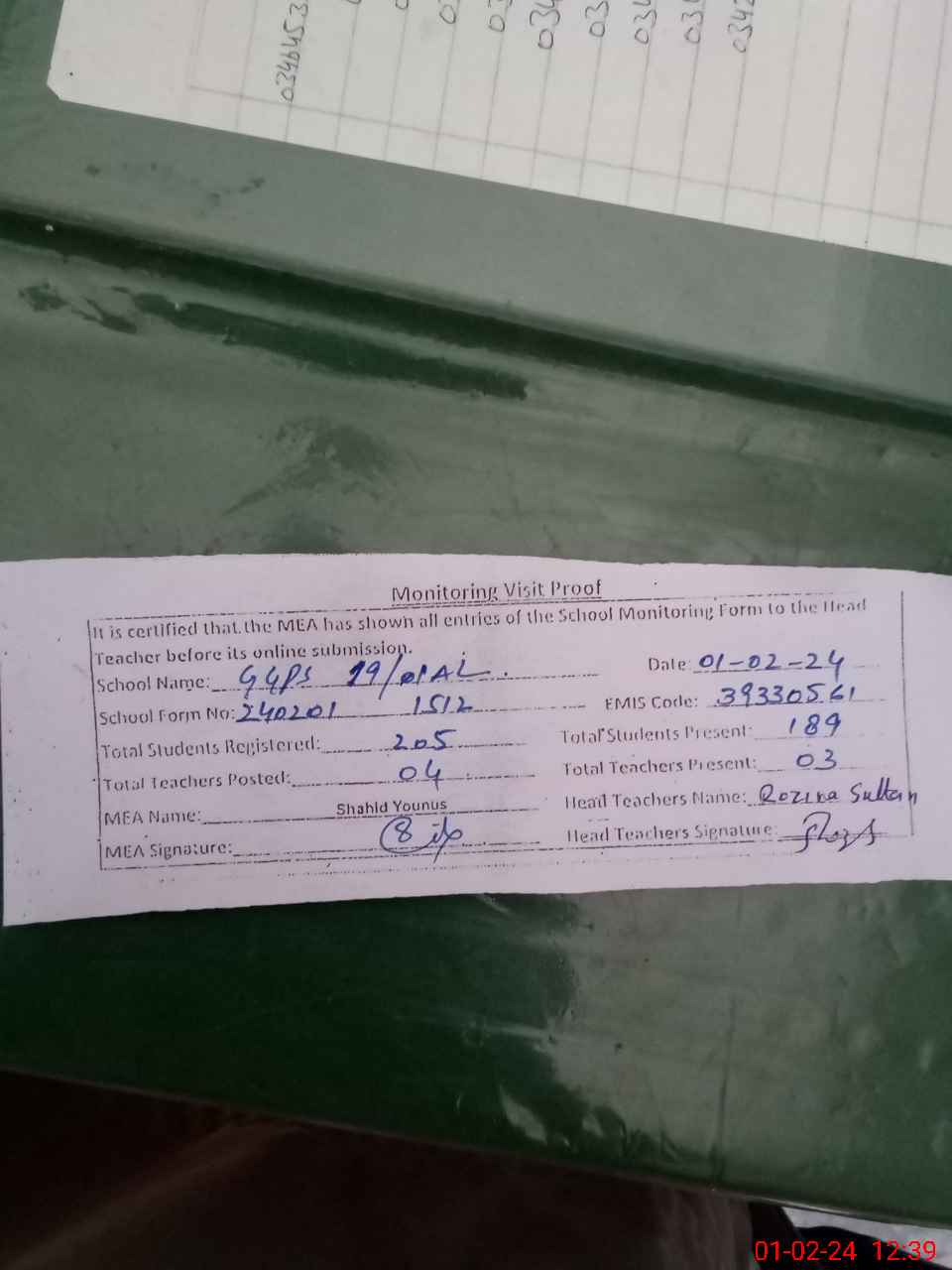 | Attendance Register | Head Teacher | MEA with School | Visit Proof |