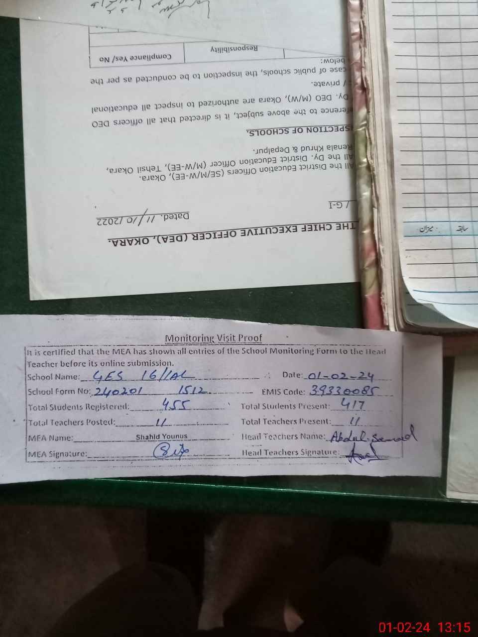 | Certified that this School was Inspected by the Undersigned MEA/DMO Today and the Information Stated Above is as Per Record. | |||||
