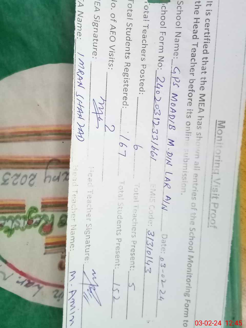| Attendance Register | Head Teacher | MEA with School | Visit Proof |
