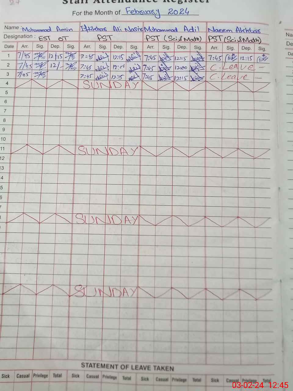 | CNIC | Full Name | Designation | R/C | Absence During Last Calender Month |