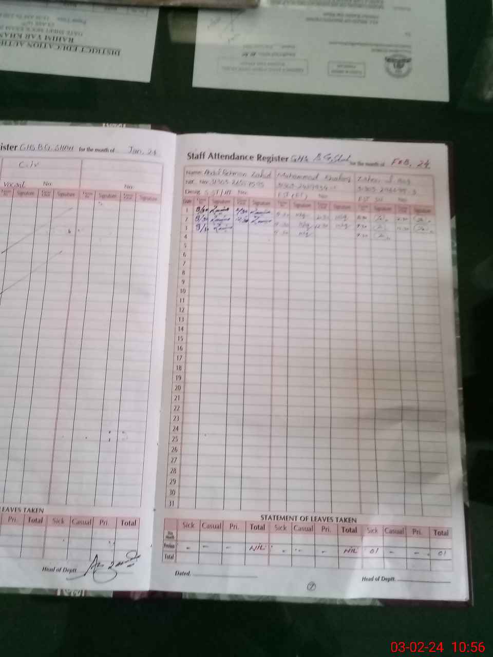 | CNIC | Full Name | Designation | R/C | Absence During Last Calender Month |