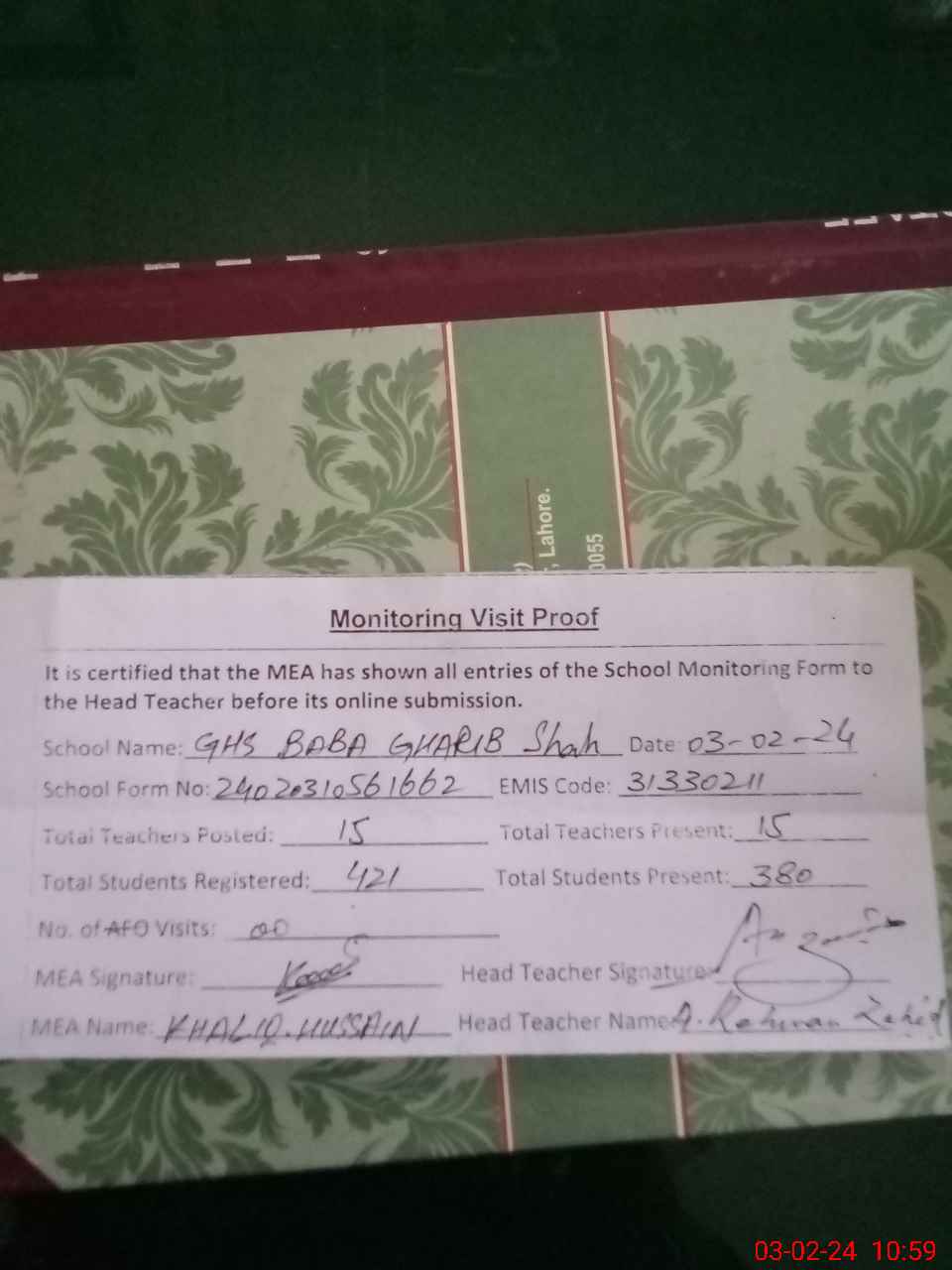 | Attendance Register | Head Teacher | MEA with School | Visit Proof |