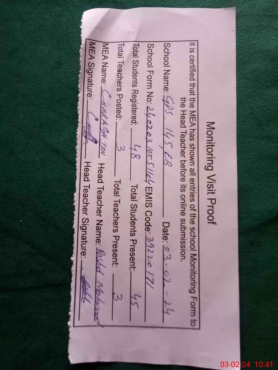 | Attendance Register | Head Teacher | MEA with School | Visit Proof |