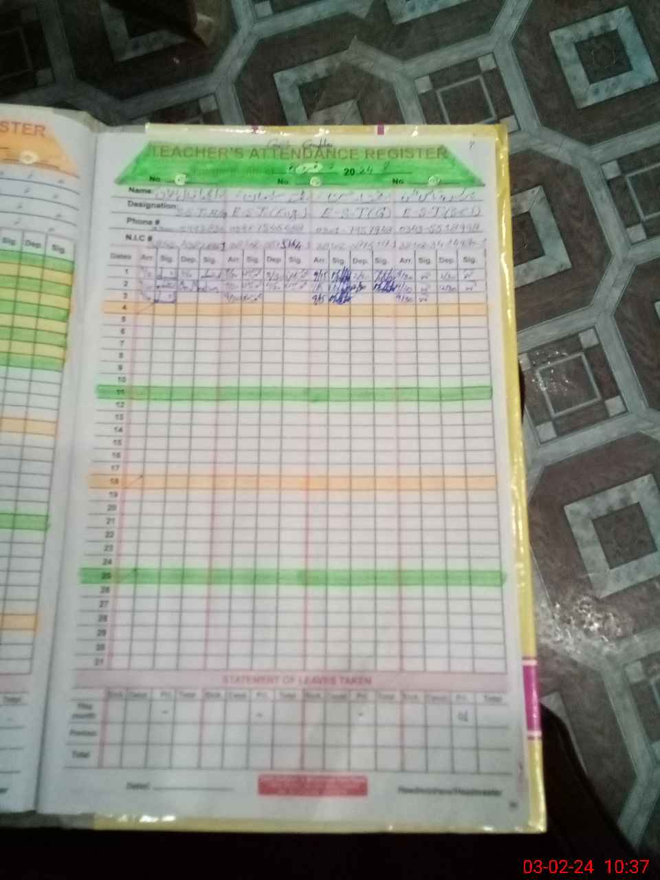 | CNIC | Full Name | Designation | R/C | Absence During Last Calender Month |