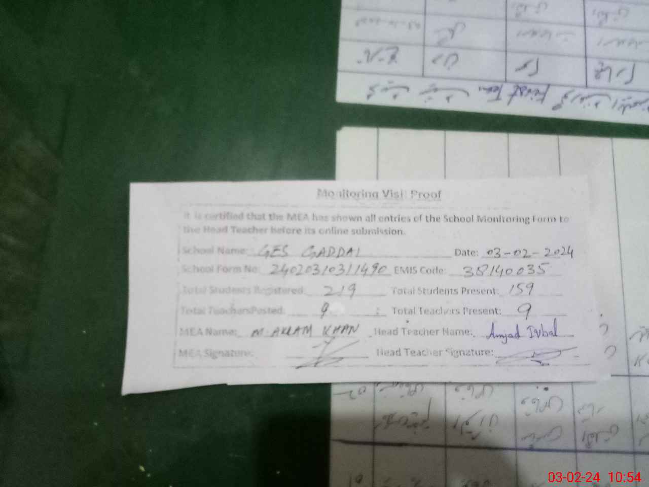 | Attendance Register | Head Teacher | MEA with School | Visit Proof |