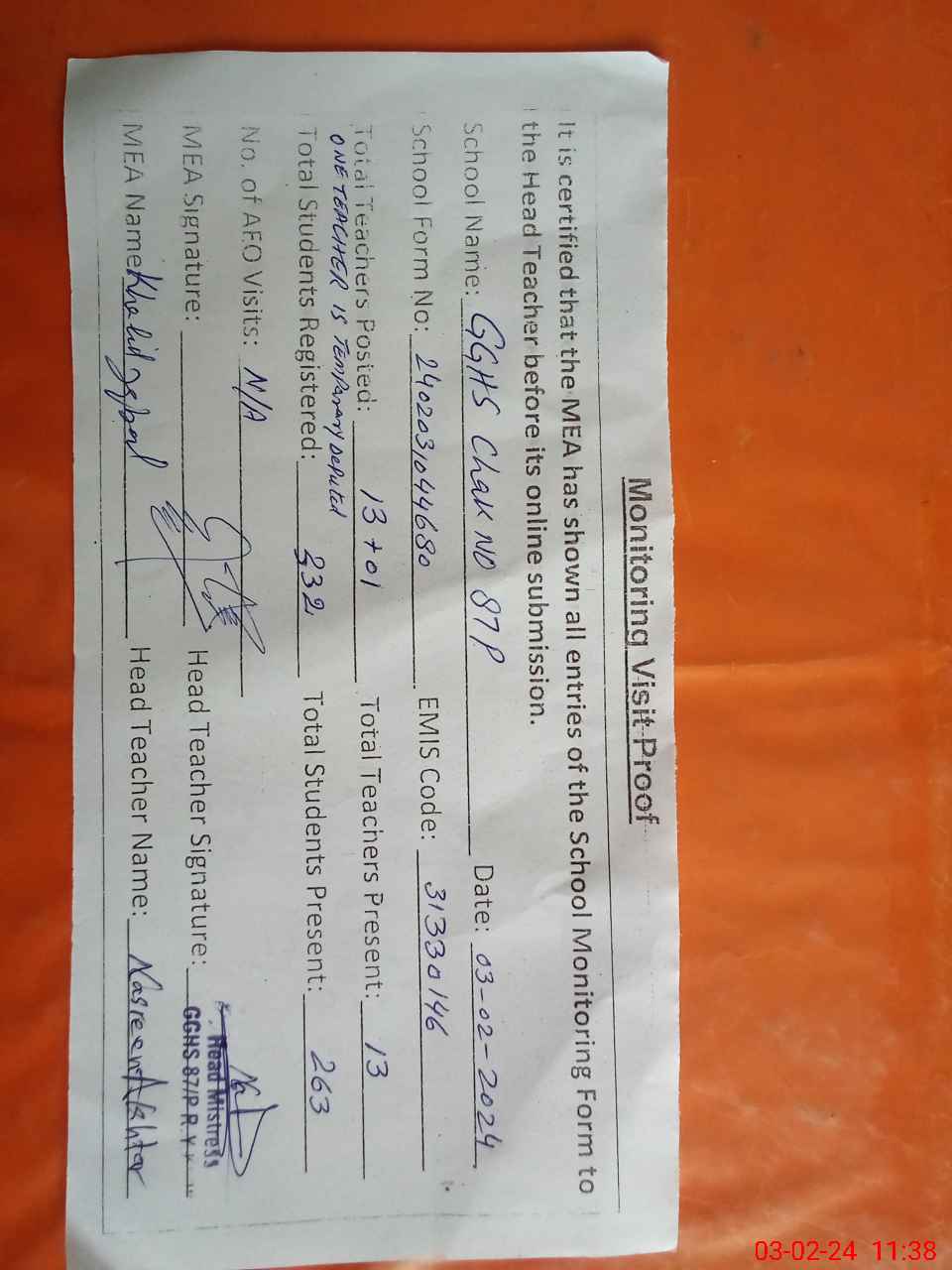 | Attendance Register | Head Teacher | MEA with School | Visit Proof |