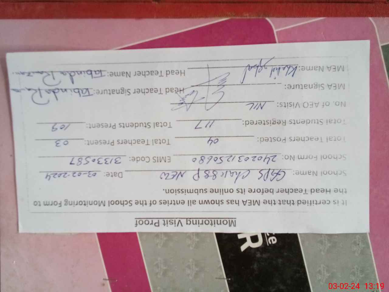 | Remarks (Use Separate Page if Required): Class verification is not updated on MEA tab as per sis and two classes are sitting in veranda | |||||