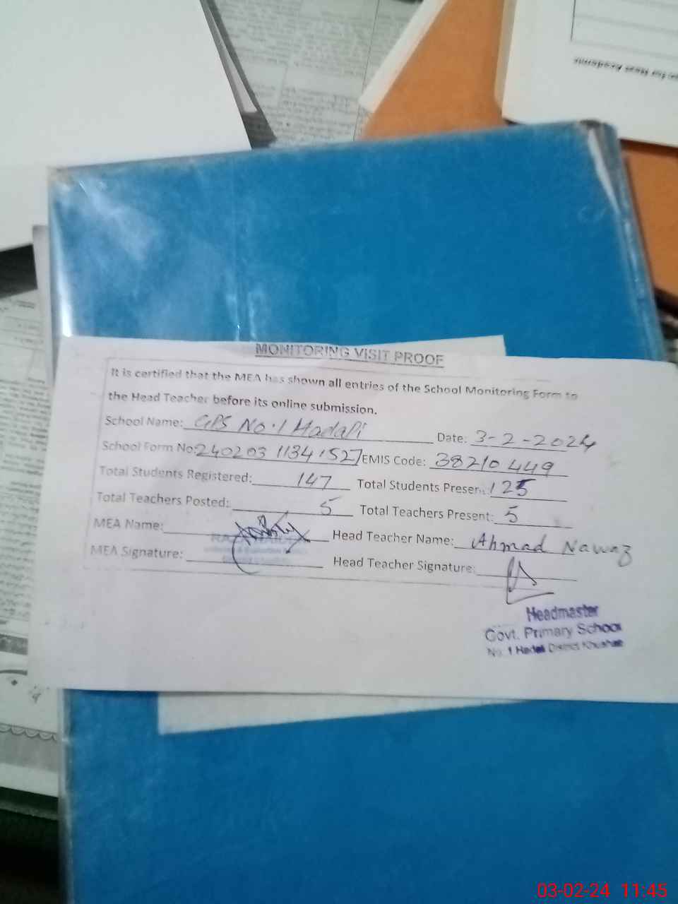 | Attendance Register | Head Teacher | MEA with School | Visit Proof |
