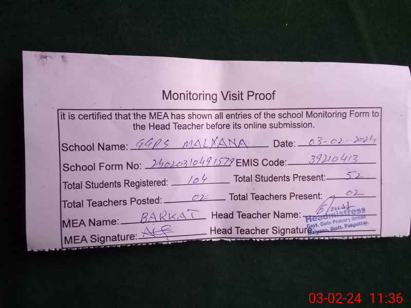 | Attendance Register | Head Teacher | MEA with School | Visit Proof |