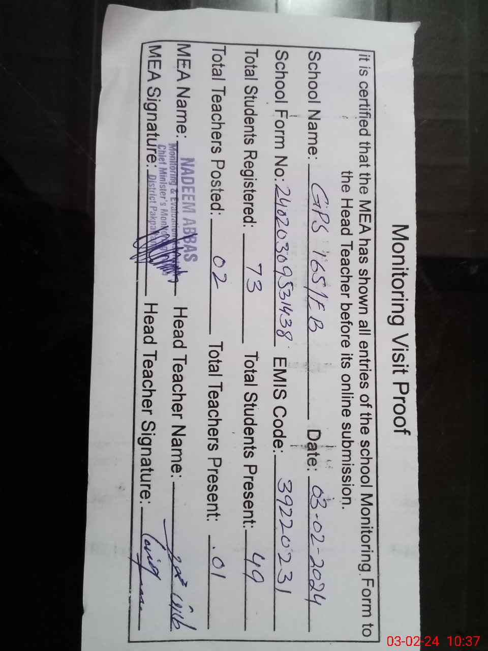 | Certified that this School was Inspected by the Undersigned MEA/DMO Today and the Information Stated Above is as Per Record. | |||||