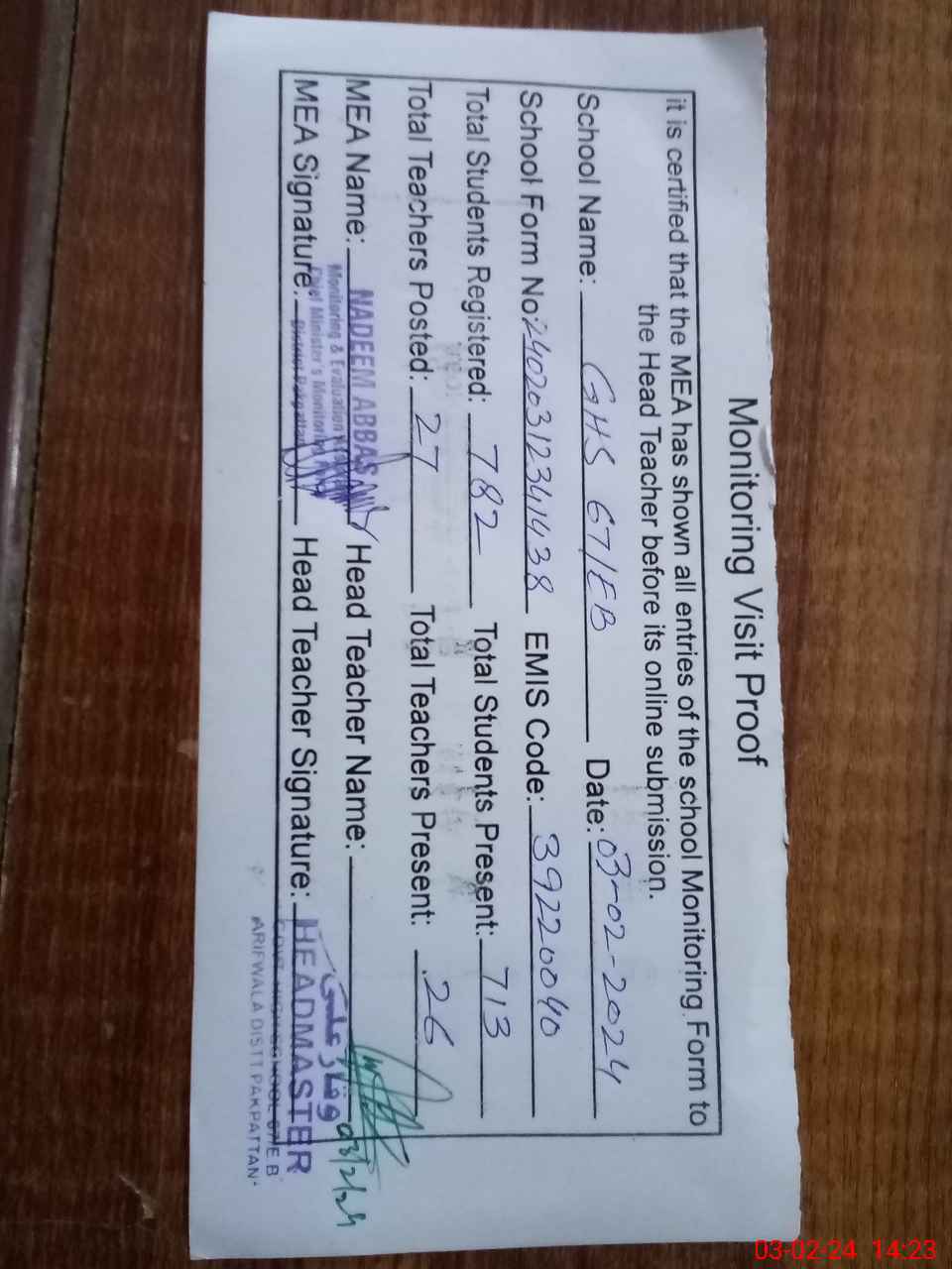 | EMIS Code: 39220040 | Name of School: GHS 67 EB | |||