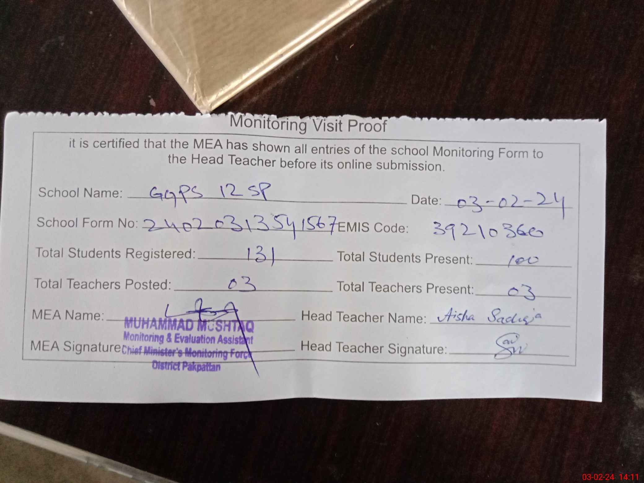 | Attendance Register | Head Teacher | MEA with School | Visit Proof |