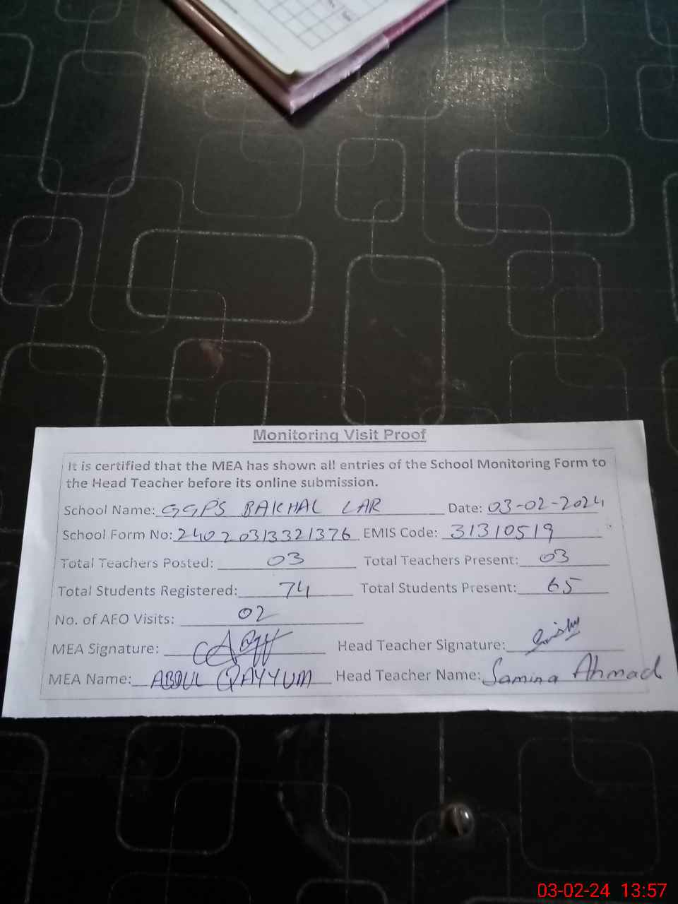 | EMIS Code: 31310519 | Name of School: GGPS BAKHAL LAR | |||