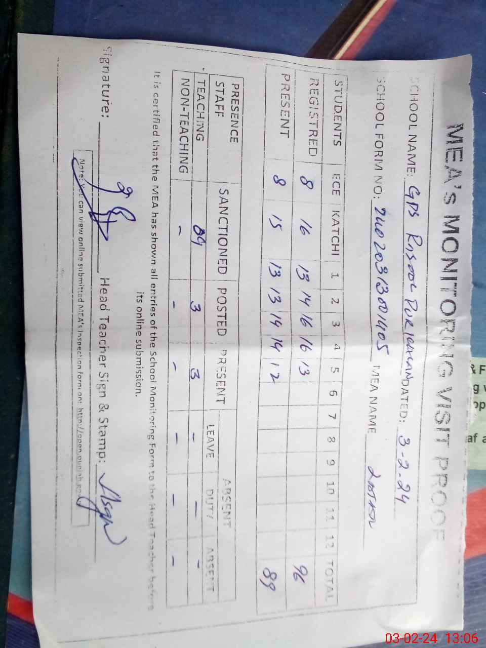 | Attendance Register | Head Teacher | MEA with School | Visit Proof |