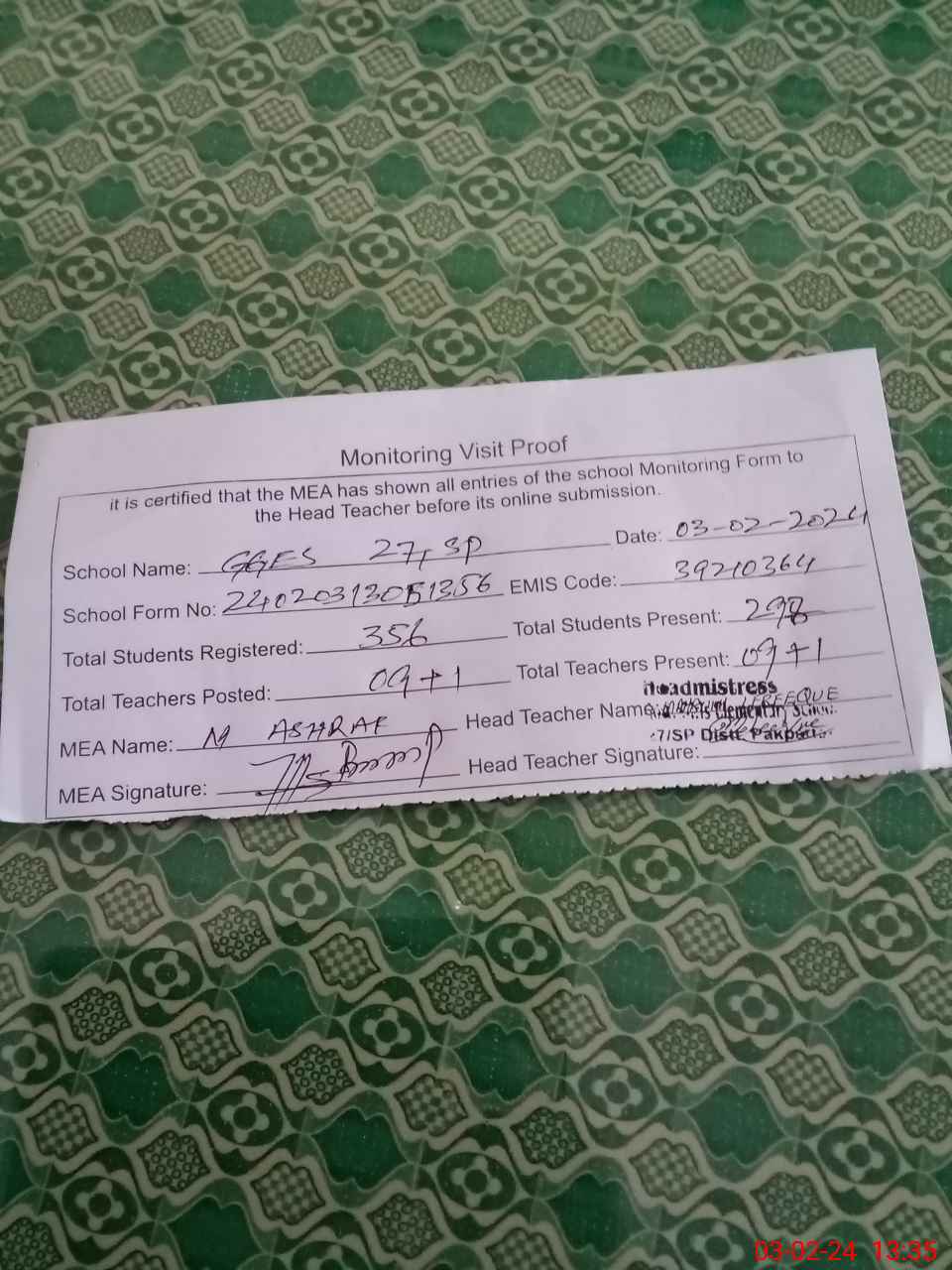| Attendance Register | Head Teacher | MEA with School | Visit Proof |